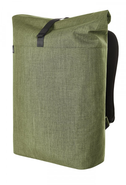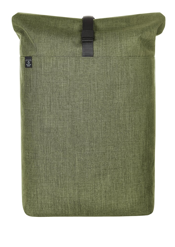 stoere stadsrugzak met magneet- en wikkelsluiting; ruim hoofdvak met verstevigd notebookvak; rPET-buitenmateriaal; vak met ritssluiting achter; sterk verstevigde rug met vak met blinde ritssluiting; verstevigde bodem; in lengte verstelbare, verstevigde schouderriemen met rubberen lussen waarin bijv. zonnebril bevestigd kan worden; handgreep