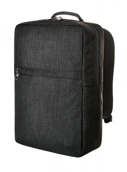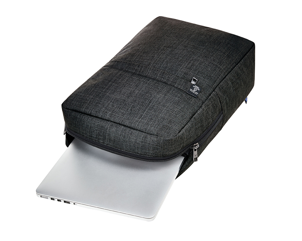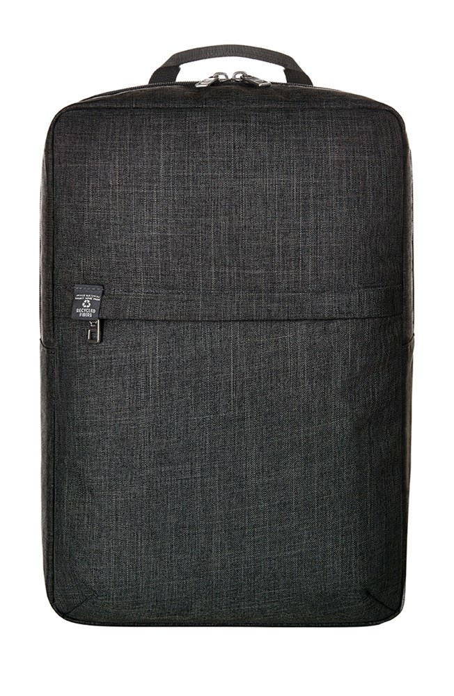 strak afgewerkte rugzak; rPET-buitenmateriaal; groot hoofdvak met 2-wegritssluiting en verstevigd notebookvak; voorvak met ritssluiting; sterk verstevigde achterkant met vak met blinde ritssluiting; in lengte verstelbare en verstevigde schouderriem met rubberen lussen om bijv. zonnebril aan vast te maken; handgreep