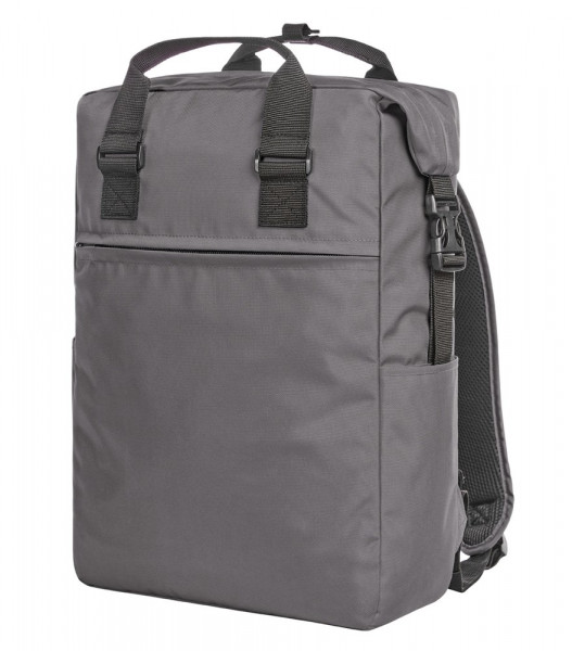 charmante rechthoekige rugzak; RPET-bovenmateriaal; ruim hoofdvak met 2-weg ritssluiting; gevoerd notebookcompartiment; plat insteekvak binnen; zijdelingse gespen voor comfortabel openen; de gespen kunnen met elkaar worden verbonden als greep; grote zak met ritssluiting aan de voorkant; twee zijdelingse insteekvakken voor bijv. drinkflessen; gevoerd draagsysteem; handgreep met drukknoopmanchet