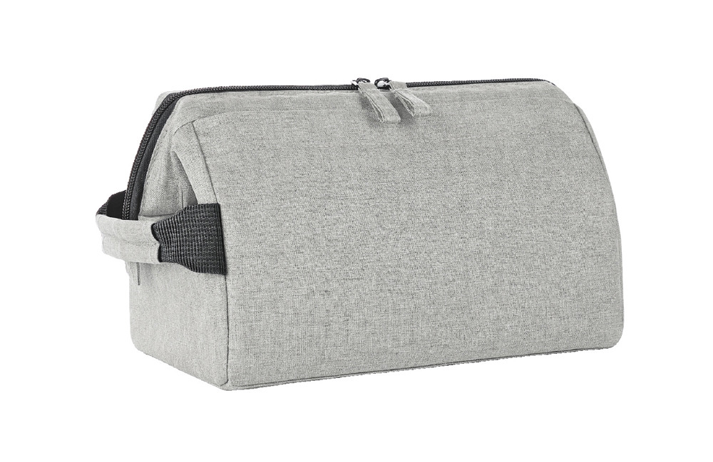 Mooie tas met ritssluiting met stabiele metalen beugelopening om te plaatsen of op te hangen; rPET-bovenmateriaal; groot, verstevigd hoofdvak met diverse organizerelementen, voorvak met ritssluiting handgreep