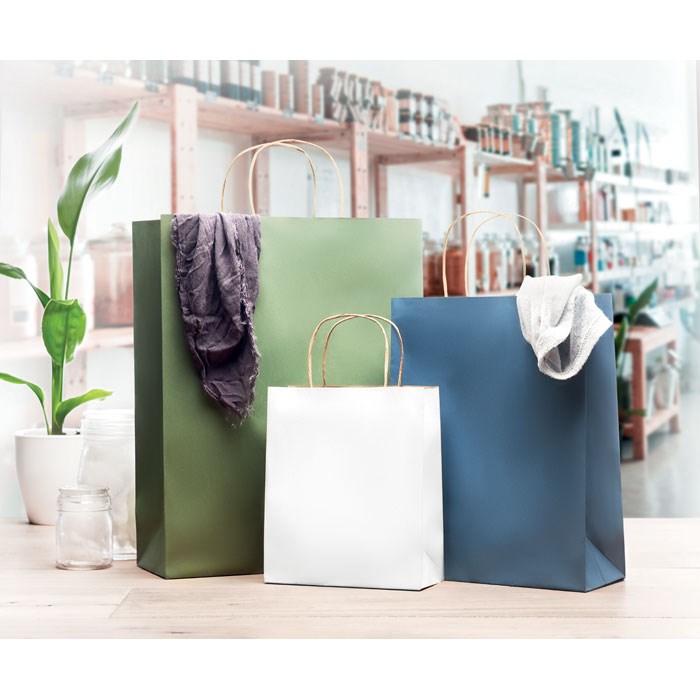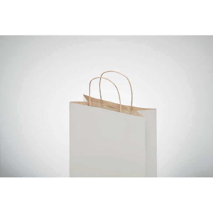 Kleine papieren geschenktas. Een papieren zak is een geweldige manier om je cadeau in te presenteren. Het is ook handig om tijdens het winkelen spullen mee te dragen. 90 gr / m². Doordat het artikel is gemaakt van kraftpapier is de kleur niet helder wit maar PMS 5315U, dit alleen geldt voor kleurcode 06. FSC®-certified | FSC MIX, P5.3, FSC-C213206