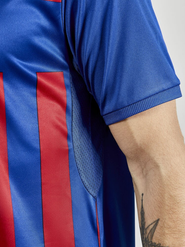 Progress 2.0 Stripe Jersey is an advanced match jersey made of stretchy and functional fabric offering superior moisture transport for maximum performance. Comes with vertical stripe design at front, solid back and a solid horizontal yoke across the chest for optimal impact of crest and/or logos. In addition, mesh panels at the armpits provide efficient body-temperature management while great elasticity ensure comfortable fit and optimal freedom of movement.