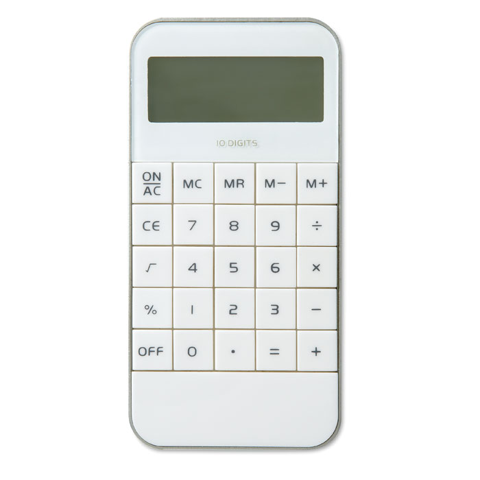 ABS rekenmachine met een 10-cijferig display, in de stijl van een iPhone® 5. Inclusief 1 AG13 batterij.