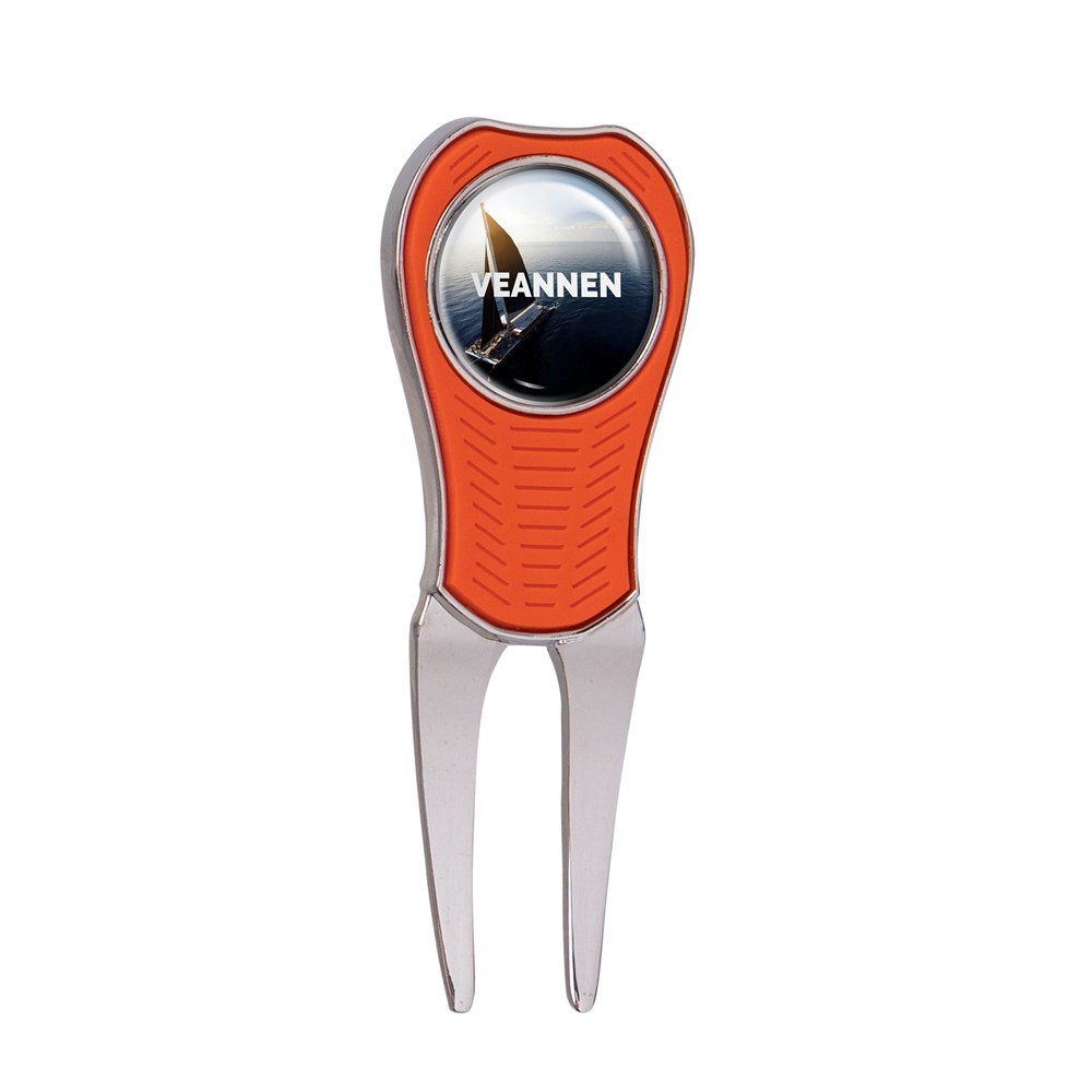 Metalen pitchfork met rubberen greep, voorzien van een magentische ball marker met doming